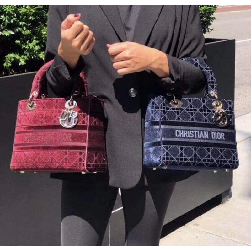 Can be ca Dior Medium Lady D-Lite Bag Burgundy Cannage Embroidered Velvet
